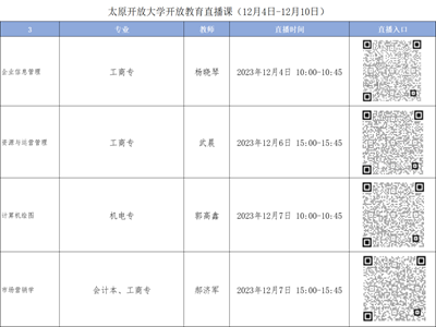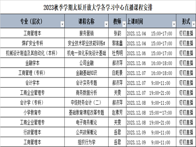 开放教育直播课面向太原开放大学全体系,欢迎已选修相关课程同学及对课程内容感兴趣的同学按时收看,专业性的课程学习辅导会让你的学习事半功倍,课程内容精彩纷呈,期待与您线上相约。